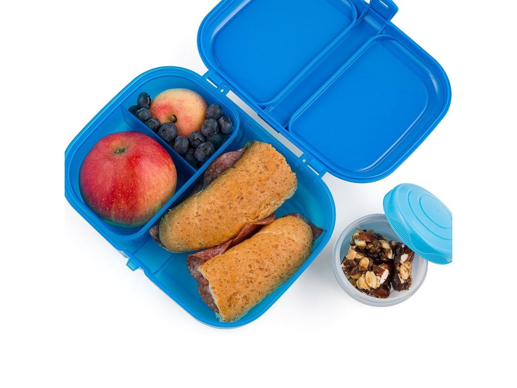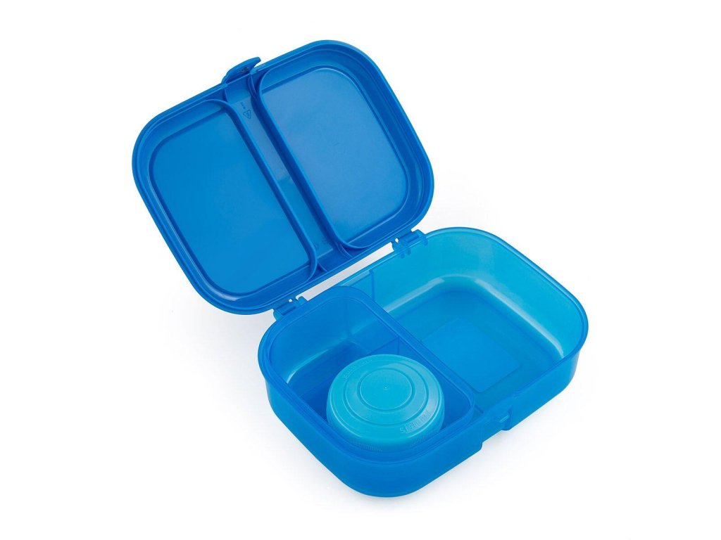 Modrý box na svačinky s vyjímatelným organizérem a šroubovací dózou na jogurt či dresink.