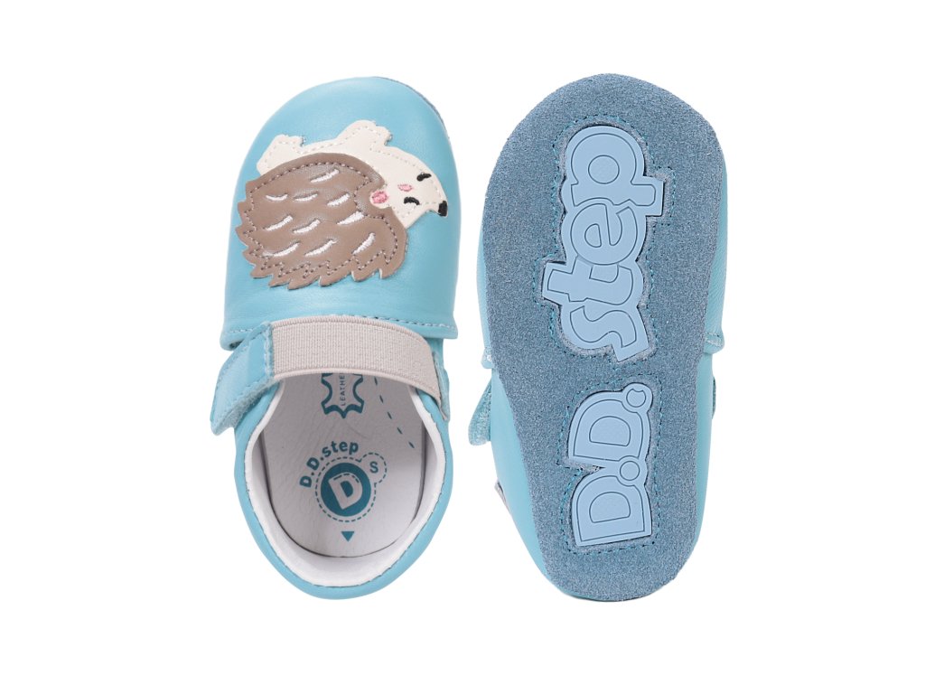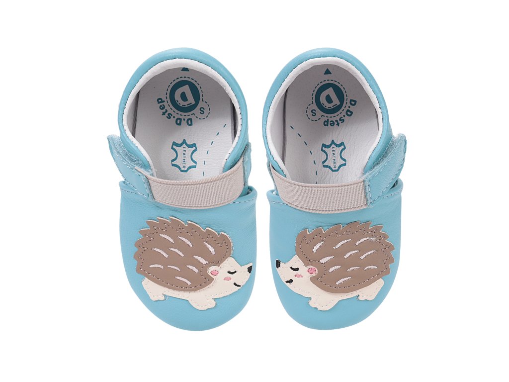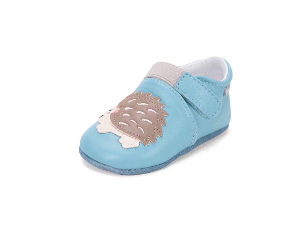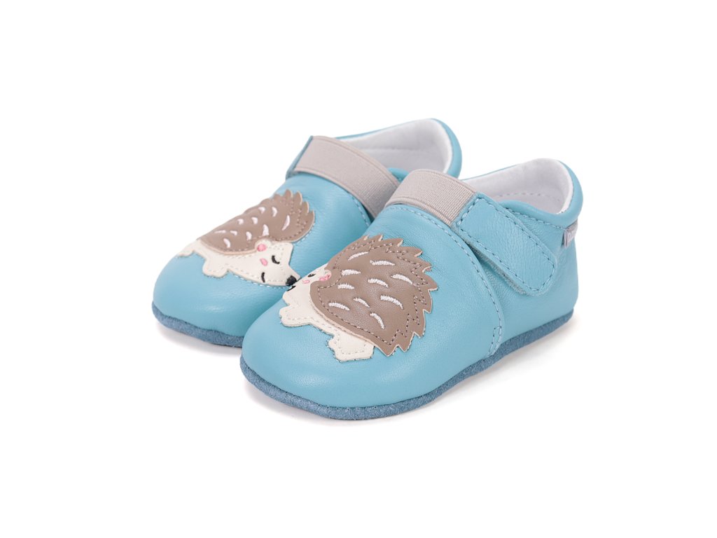 Celokožené capáčky s protiskluzovou podrážkou v modré barvě s motivem ježka.