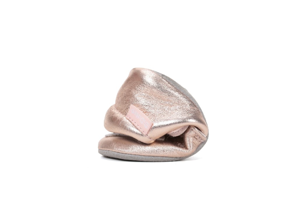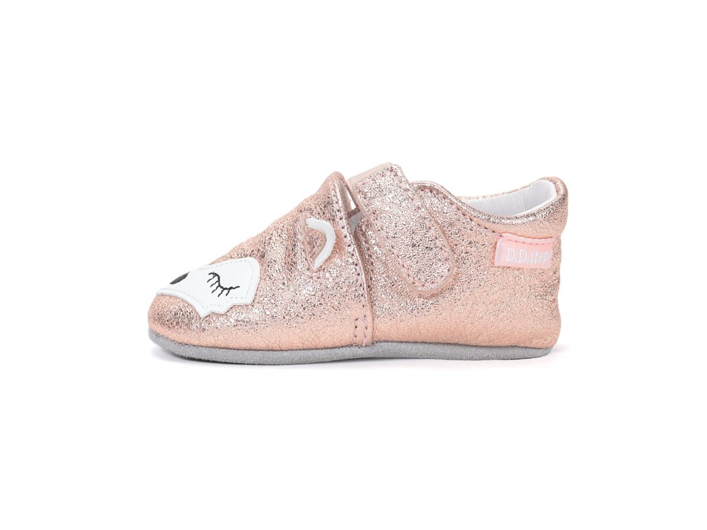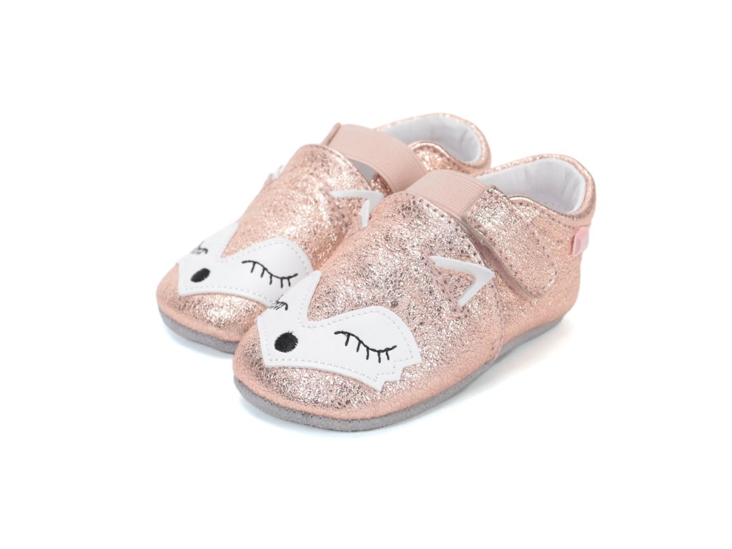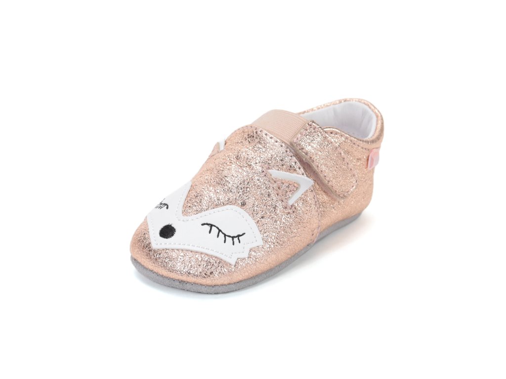 Celokožené capáčky s protiskluzovou podrážkou v růžovo-zlaté barvě s motivem lišky.
