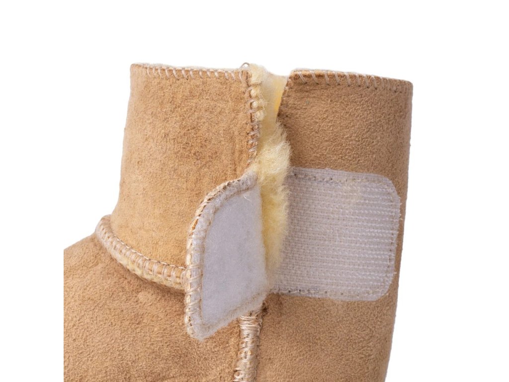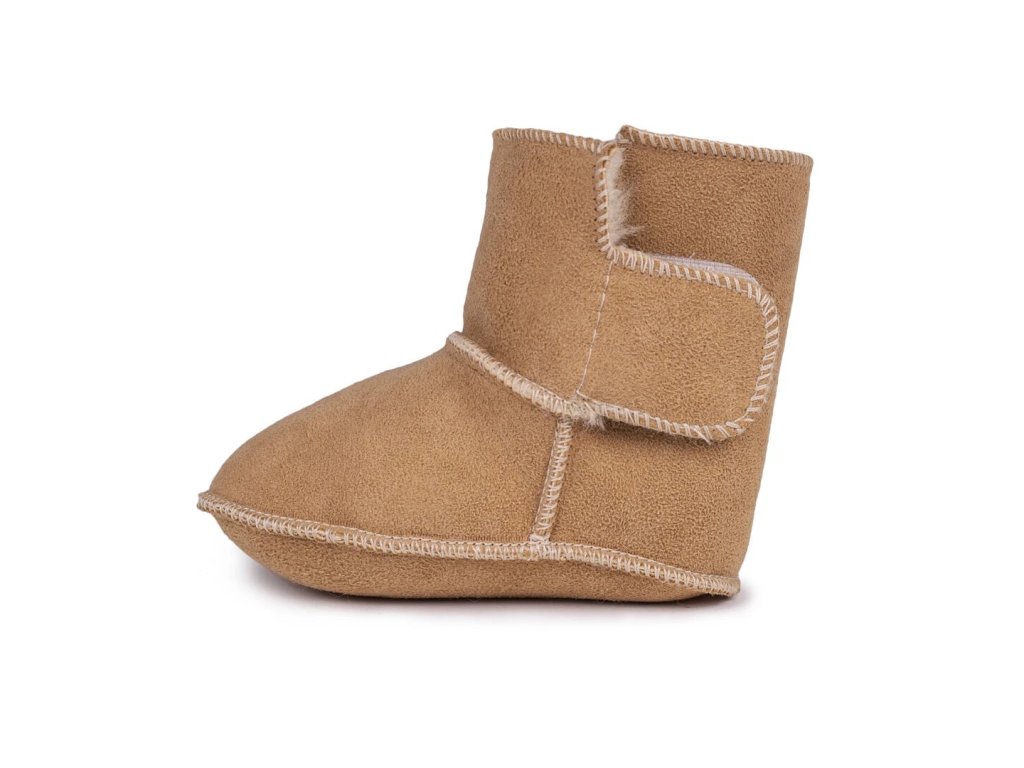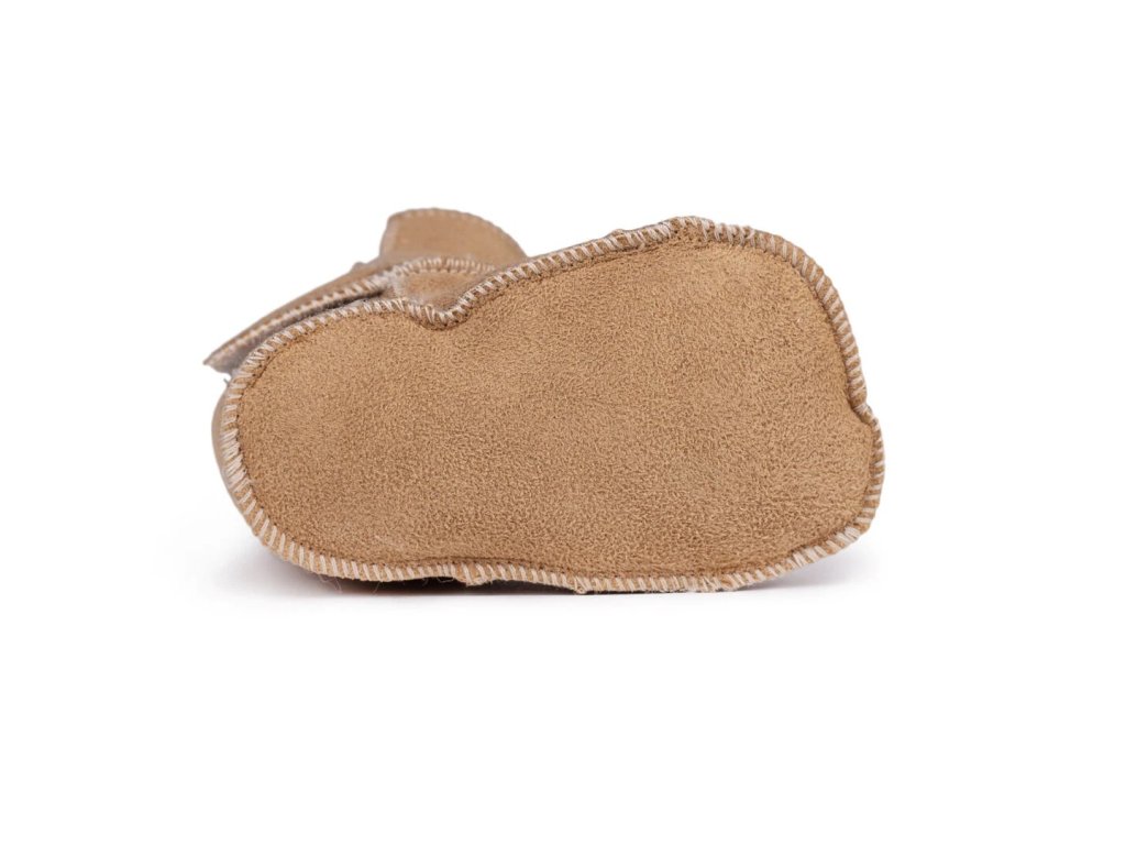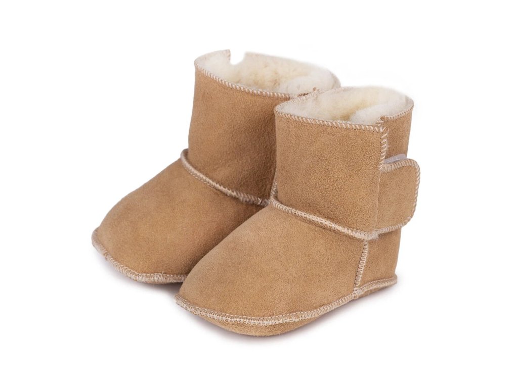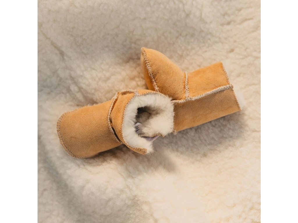 Dětské capáčky s jehněčí kožešinou v přírodní hnědé barvě udrží nožky miminek v teple za každého počasí.