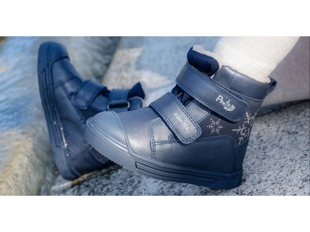 Nepromokavá kotníková obuv v tmavě modré barvě s vločkami.