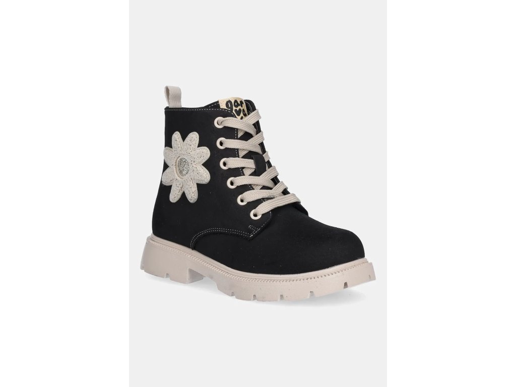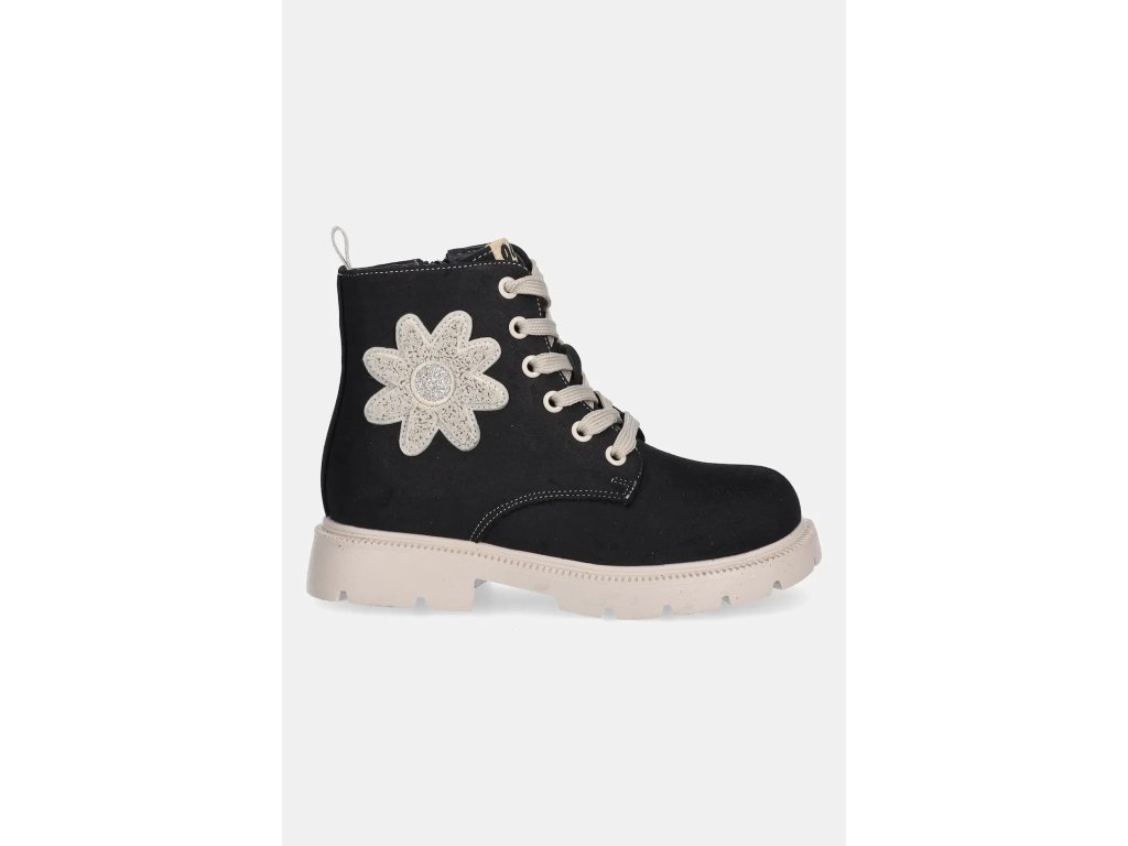 Kotníkové boty pro dívky v černé barvě s béžovou kytkou.