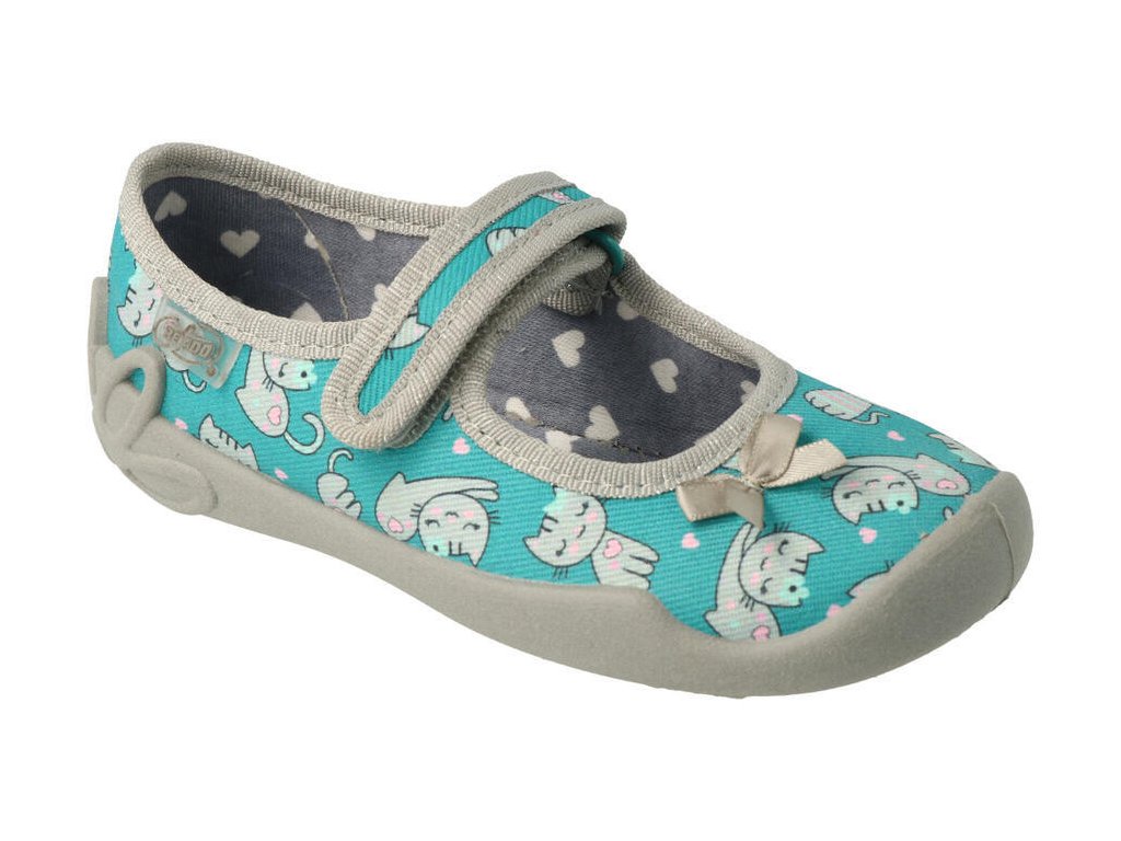 Dívčí přezůvky balerínkového střihu v tyrkysové barvě s motivem kočiček. Hodí se jako volnočasové přezůvky, přezůvky do školky, školy a družiny.
