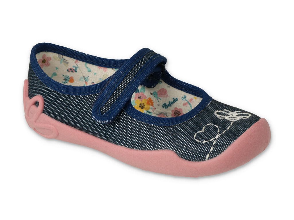 Dívčí přezůvky balerínkového střihu v modré barvě s včelkou. Hodí se jako volnočasové přezůvky, přezůvky do školky, školy a družiny.