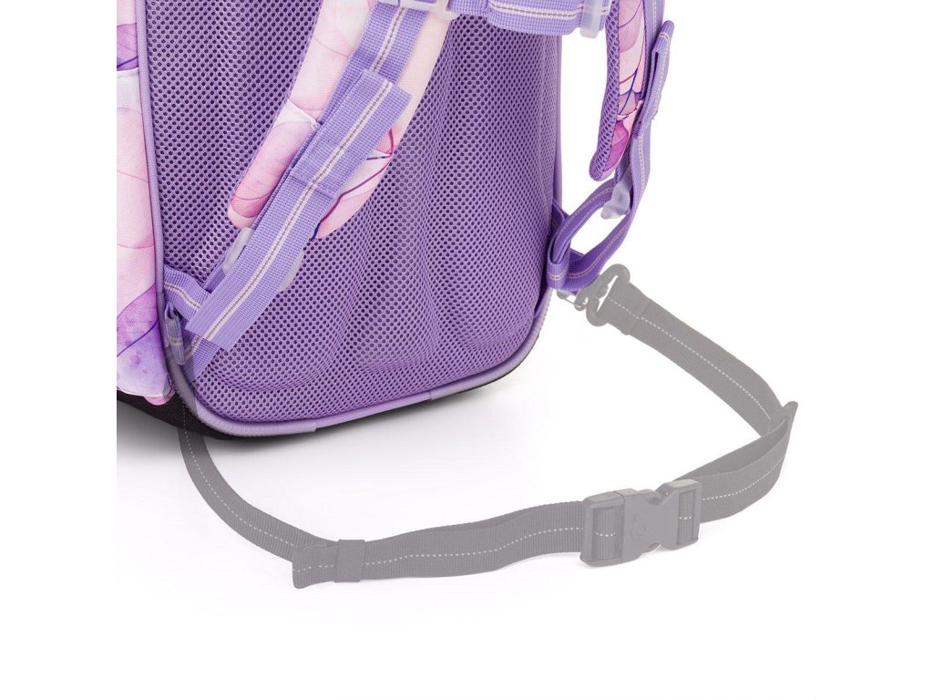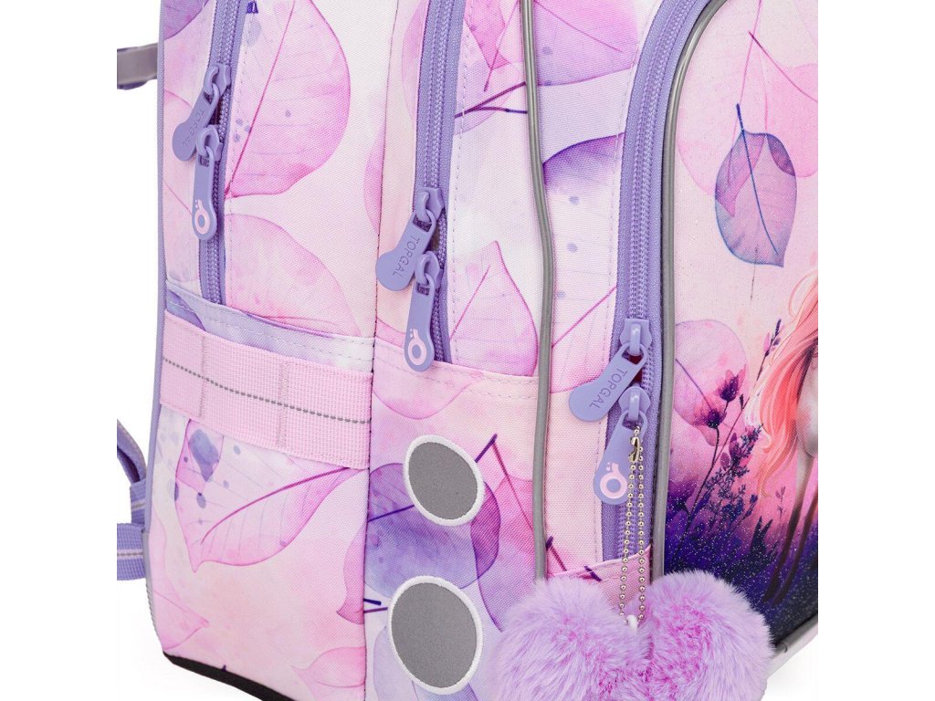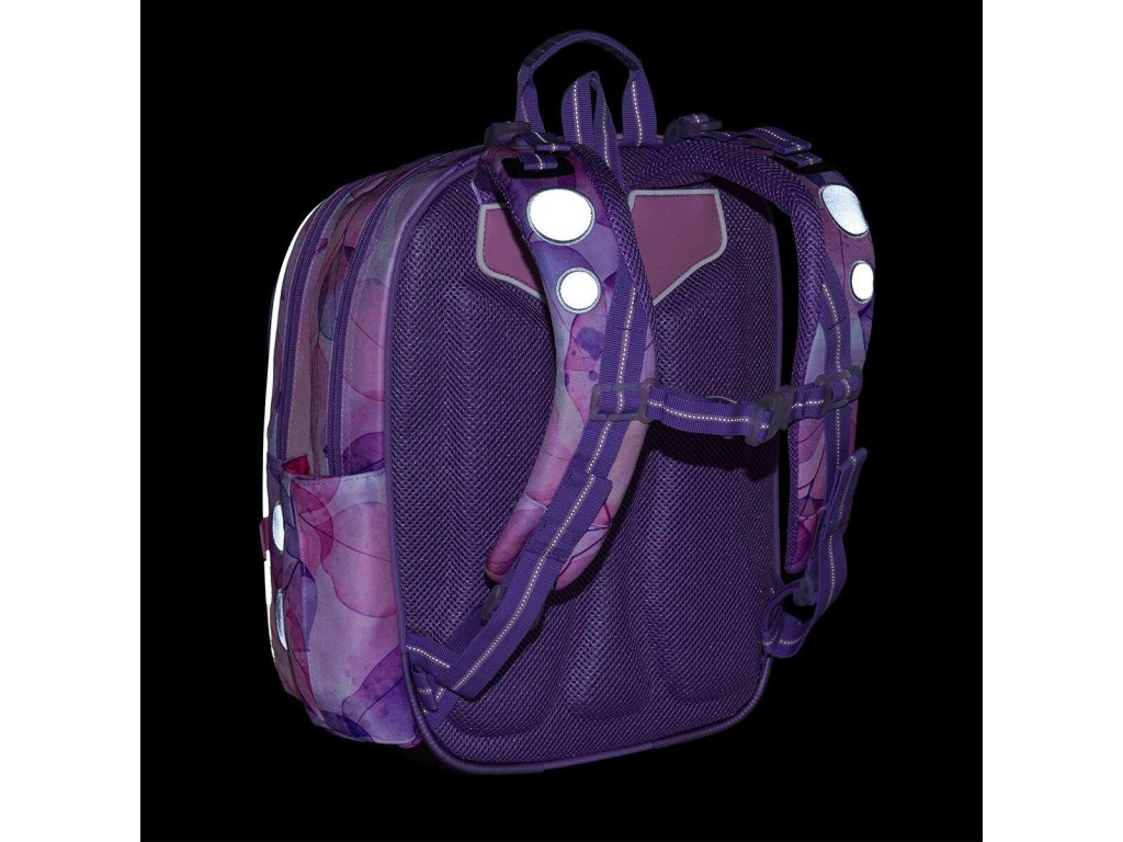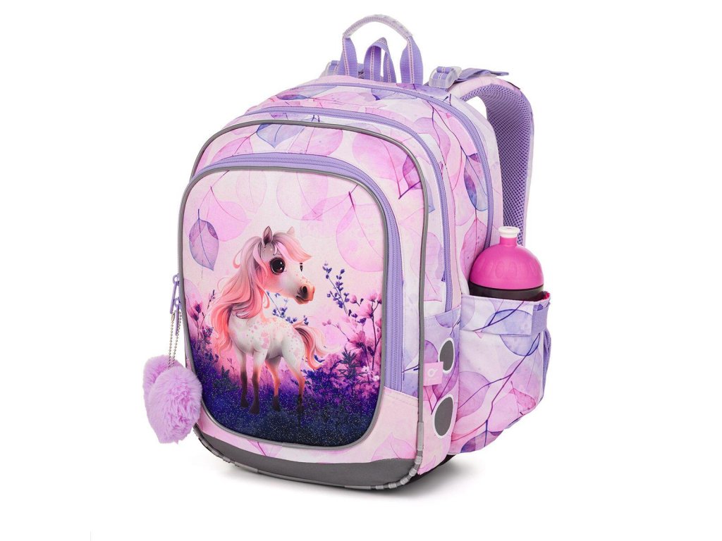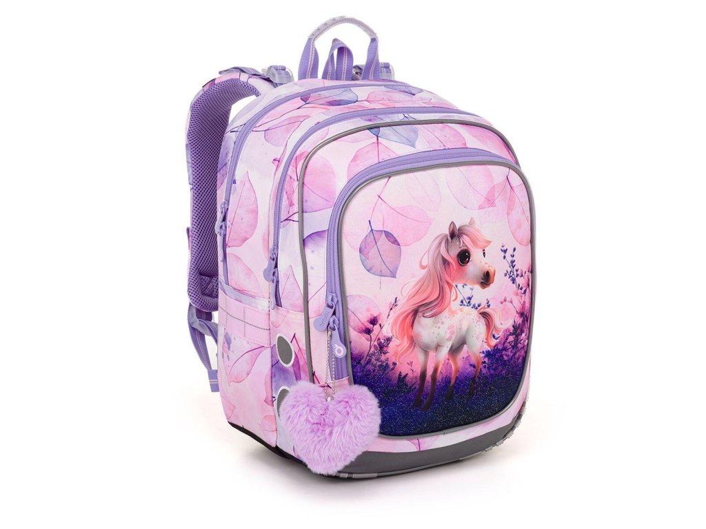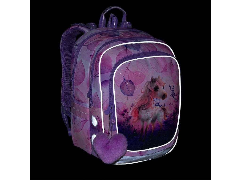 Lehoučký školní batoh ENDY v něžných odstínech fialové s roztomilým koníkem a huňatým srdíčkem. Skvělý parťák pro malé školačky od 110 cm.